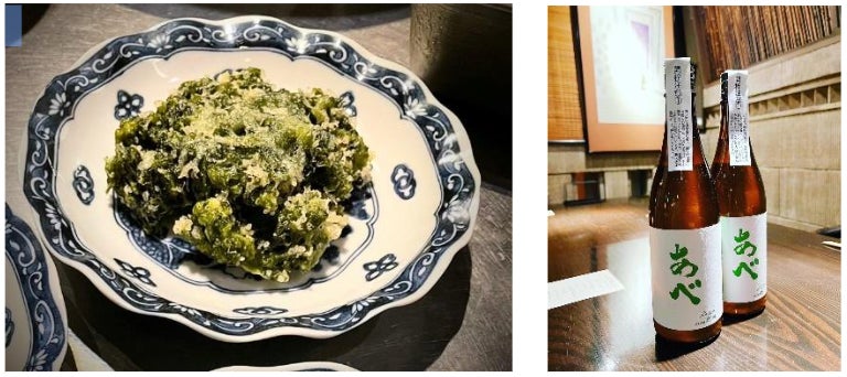 (ペアリングのポイント:繊細な美味しさの松川浦産あおさ海苔の天婦羅と海沿いの酒蔵で作られるあべグリーンの研ぎ澄まされた旨味のペアリングです)